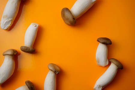 Eatable eringi, king trumpet, french horn mushroom flat lay full frame on glossy yellow background. Top view, vivid color, no people horizontal image style. For your food, eating, still life design.