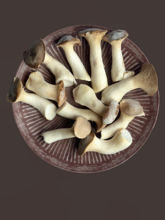 Raw brown king oyster mushrooms on a brown striped plate, placed on a brown background,