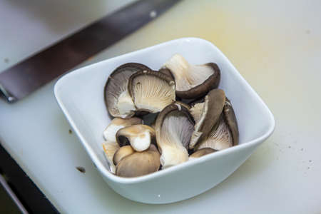 oyster mushrooms, cutting and cooking in the kitchen closeup.