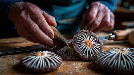 This evocative image captures the artistry of preparing shiitake mushrooms, highlighting the intricate details of the mushroom caps and hands at work.
