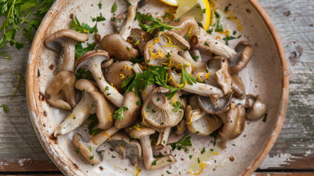Ear mushrooms arranged on a ceramic plate, garnished with fresh herbs and lemon zest
