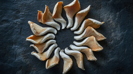 A creative shot of king oyster mushrooms arranged in a circular pattern on a dark slate background, showcasing their unique shapes and textures for a food styling effect.