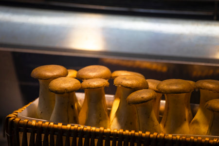 Mushrooms grown in special soil in a mushroom factory. In a close-up view