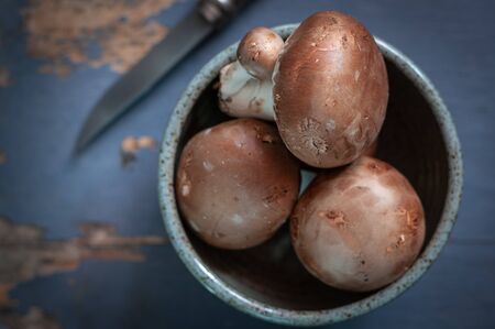 Brown Paris or portobello mushrooms painted blue table,top view.