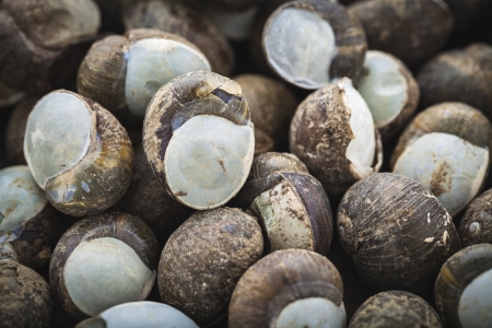 Farmer shows a bucket full of harvested snails to cook them.
