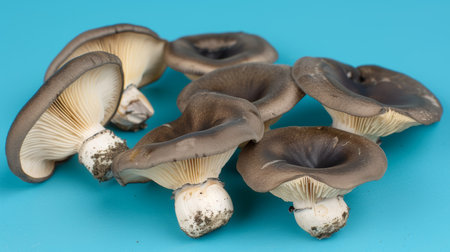 Fresh mushrooms on a blue background. Cultivation of mushrooms. Generative AI