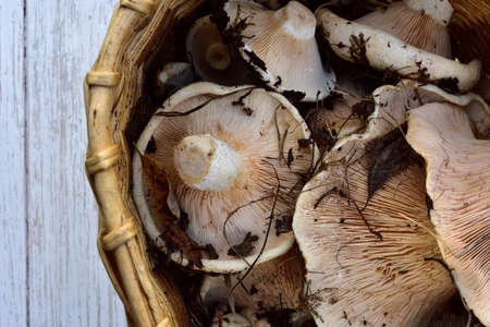 white milk mushrooms in a basket on a wooden vintage table, top view