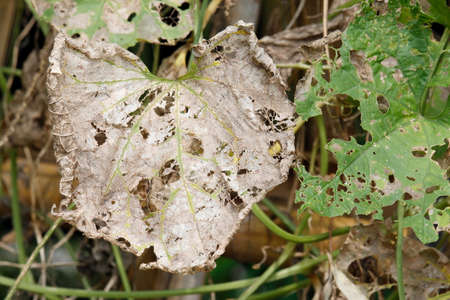 diseased cabbage leaves affected by pests and pathogenic fungi. Cabbage leaves spoiled by frost.