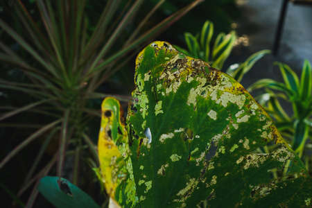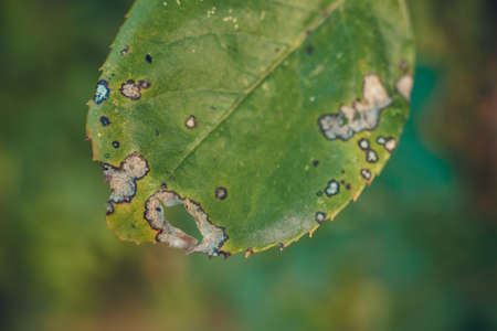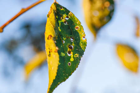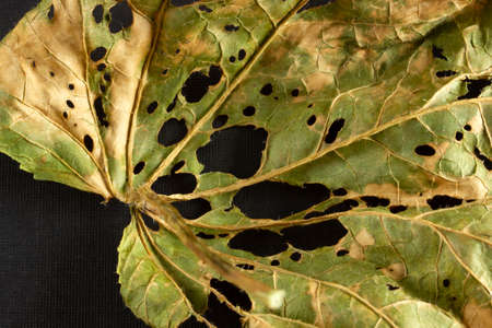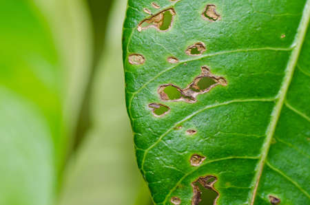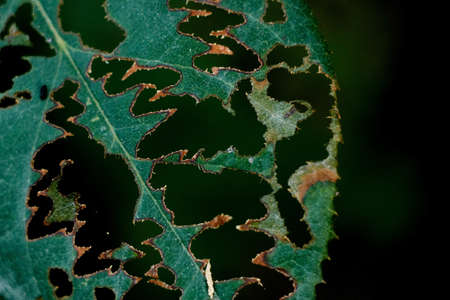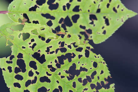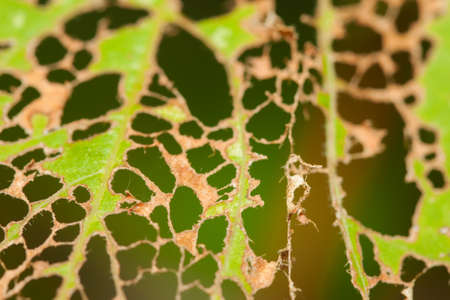 leaf with holes eaten by pests macro selective focus