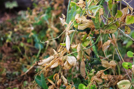Side view of peas in a garden along a string trellis
