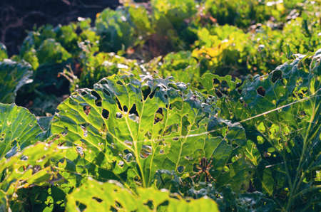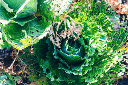 cabbage diseases. Cabbage leaves damaged by pests. the caterpillars ate the cabbage worm leaves.
