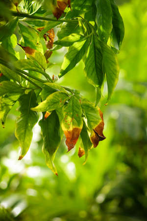 Brown damage by anthracnose on the green leaf of Robusta coffee plant tree, Plant diseases that damage agriculture