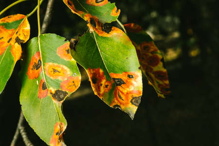 Red spots on the pear leaves. The tree is sick with a fungus