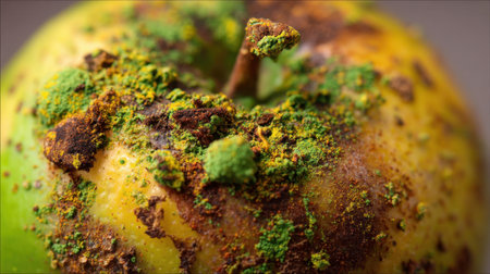 This macro photograph features a close-up view of a rotten apple, showcasing intricate details of mold and fungi growth on its surface.