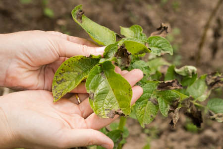 Leaves Of Potato With Diseases. Plant Of Potato Stricken Phytophthora (Phytophthora Infestans) In Vegetable Garden Close Up.