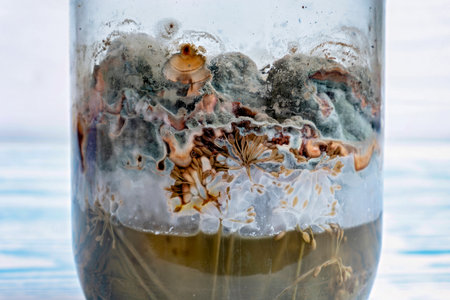 spread of green fungal mold on spoiled food products, macro view through a microscope