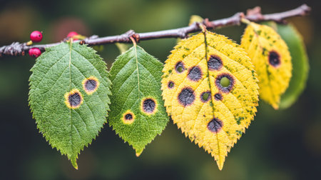 A macro shot of green and yellow leaves on a twig affected by a plant disease. The leaves are covered in dark, circular spots, a symptom of a fungal pathogen.