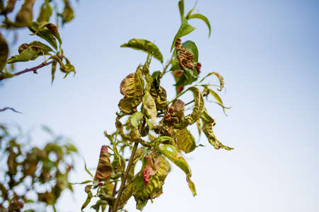 Diseases on peach leaves close-up, spring season, garden.