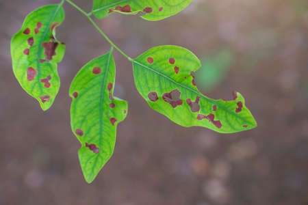 The leaves are eaten by insects on blurred background with warm light
