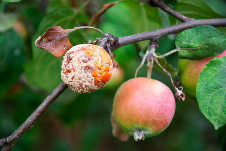 Rotten apple on an apple tree. The apple has rotted next to the strong fruit.