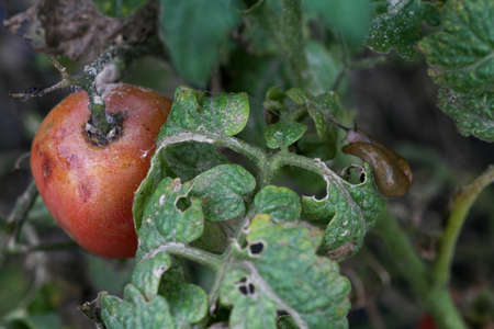 A closeup of a slug tomato pest on a fresh garden . Insects destroy green and ripening fruits. In addition, slugs carry infections among plants. a significant decrease in productivity loss of yield.