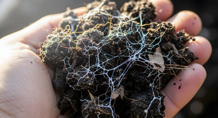A close-up shot of a person's hand holding a clump of rich, dark soil. An intricate network of white mycelium, the root structure of fungi, is clearly visible, threading through the soil clumps, highlighting the concept of a healthy soil ecosystem.