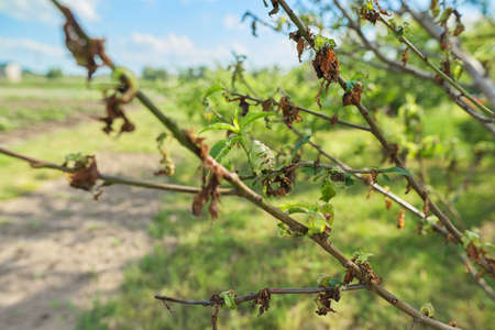 Plum branch with wrinkled leaves affected by black aphid and spider net. Plum aphids, black fly on fruit tree, severe damage from garden pests. Selective focus, closeup, blurred.