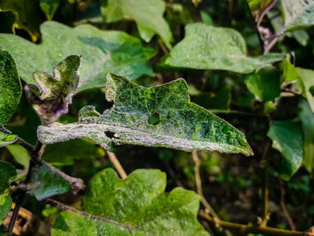 Some so small dew drops are fallen on the green Eggplant leaf in the morning