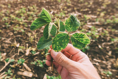 Agronomist examining soybean seedling in field, close up of hand holding Glycine Max sprout, selective focus