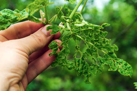 Insect infestation on a leaf with multiple holes in it causing damage to the plant on a hot sunny day in summertime