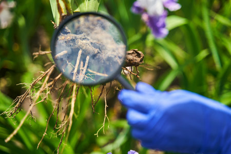 Fungal spots on leaves. Common Plant Diseases. Black spot or blotches on garden plant. Blight infected stems. Canker wounds by bacterial pathogens. Man holding foliage with brown areas and yellow halo