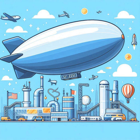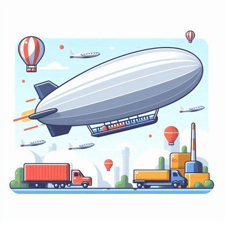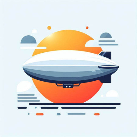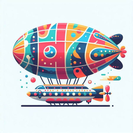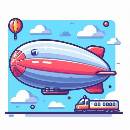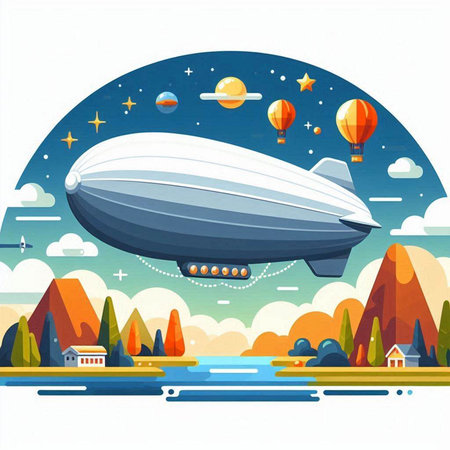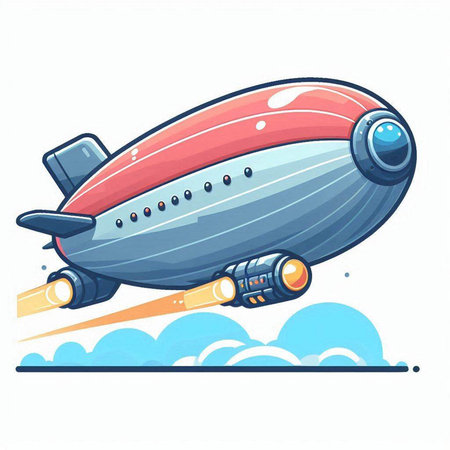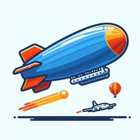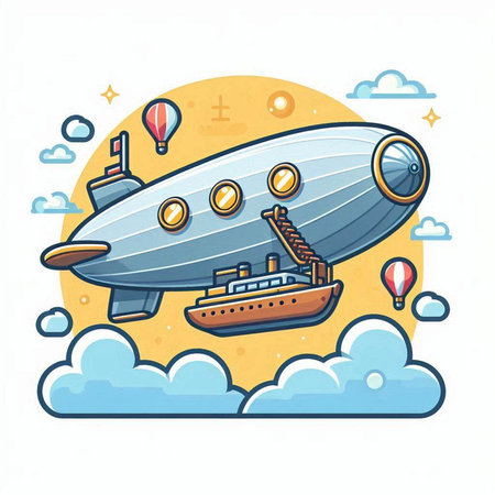 Airship airship transport vector illustration. Cartoon airship flying with rocket and submarine