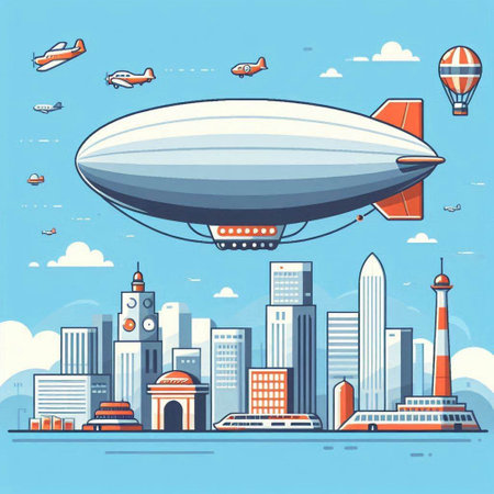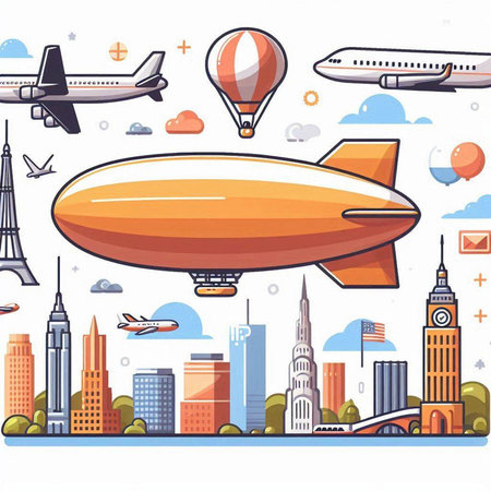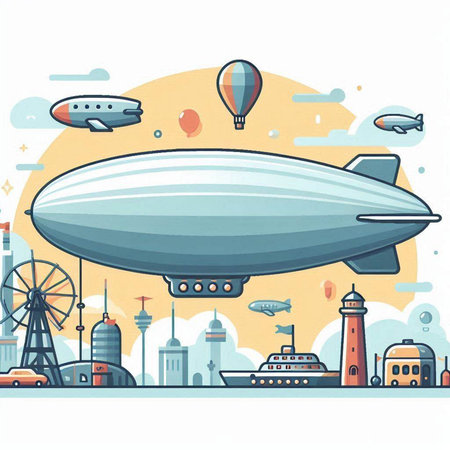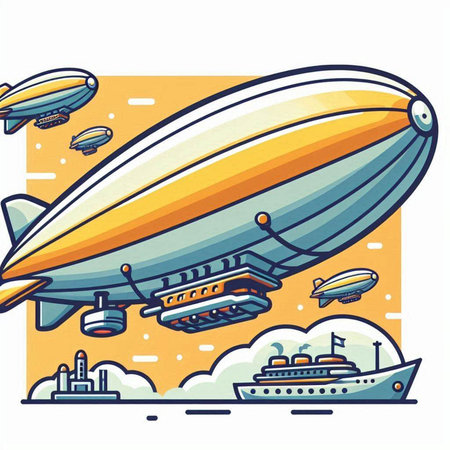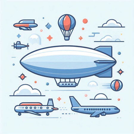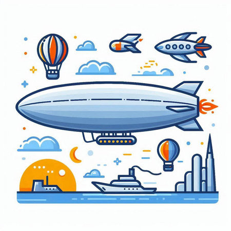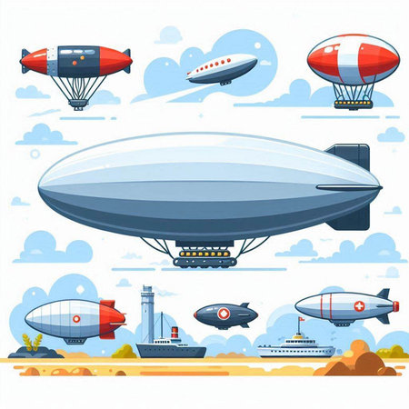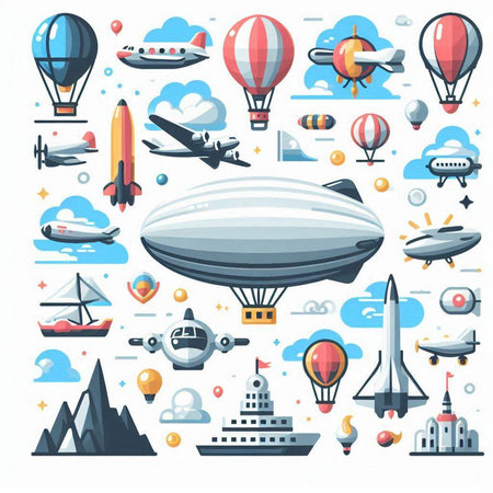 Airship, ship, plane, submarine, cruise ship. Vector illustration