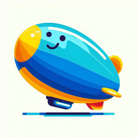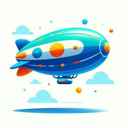 Vector illustration of cute cartoon airship in blue and orange colors.