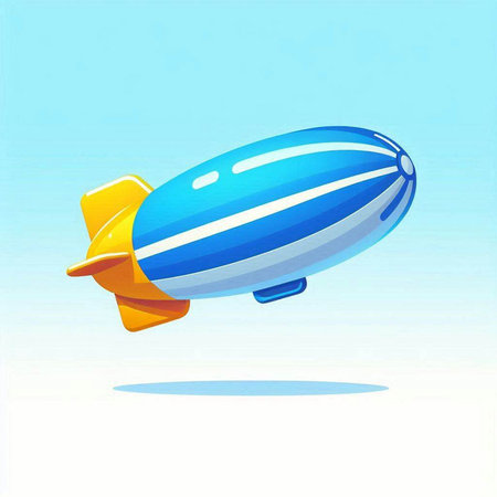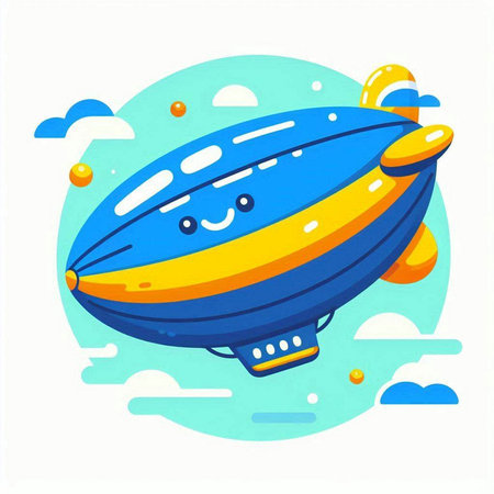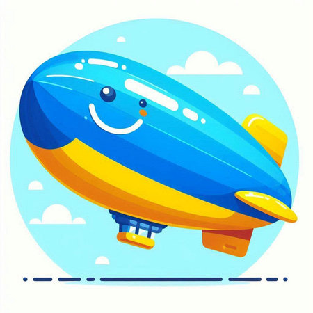 Cartoon airship in blue and yellow colors. Vector illustration.