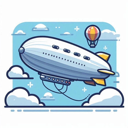 Airship in the sky with clouds. Cartoon style vector illustration.