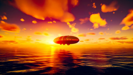 A magnificent futuristic airship floats gracefully among fluffy clouds during a breathtaking sunset. The scene captures a blend of adventure and innovation.