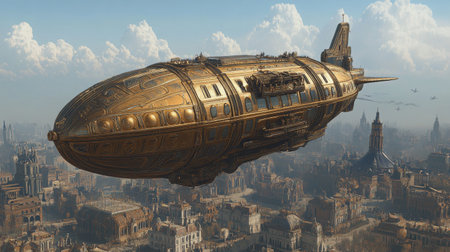 An elaborate steampunk airship glides through a clear sky above an intricate city. The sun casts warm light on detailed architecture and bustling streets below.
