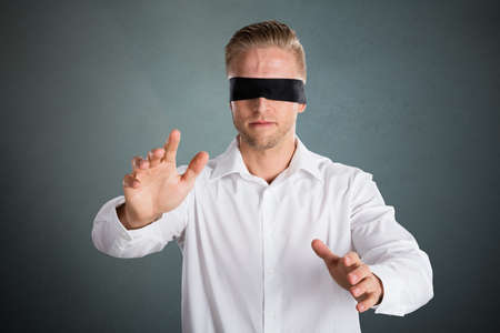 young lost and confused man blindfolded with necktie playing internet trend dangerous viral challenge with eyes blind acting doubtful guided by intuition isolated on dark background