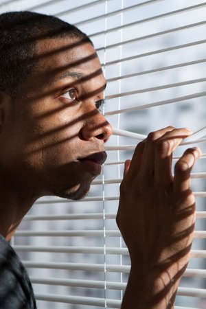 finger on the blinds on the window of the house, look out the window through the blinds from the house
