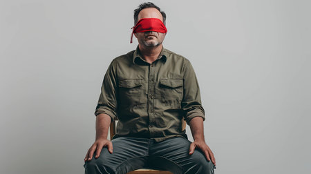 Portrait of a middle-aged Asian man with a blindfold, posed against a muted yellow background with ample copy space.ai generated