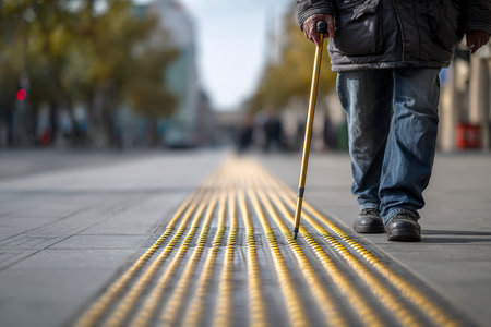 visually impaired person, with sunglasses and cane for the blind, social inclusion, blurred background generative ai