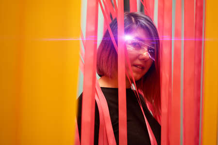 Vertical closeup portrait of young Asian woman wearing cyberpunk style sunglasses in futuristic set