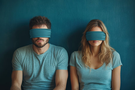 A man and woman sit side by side, blindfolded in a trust-building activity.