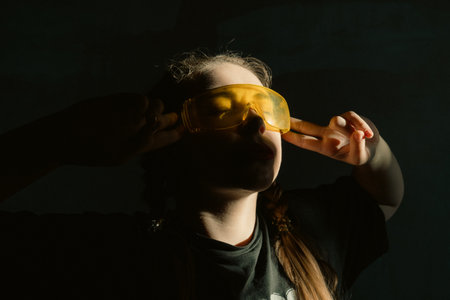 Girl in smart yellow glasses. virtual reality glasses. Atmospheric fashion photos