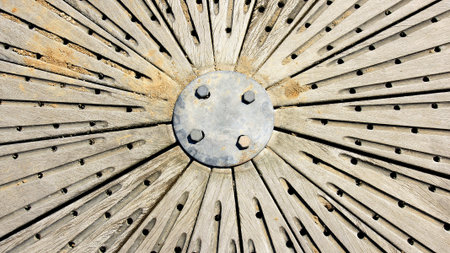 Circular rivets in wood deck.