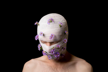 a portrait of a guy his head is wrapped in a bandage, flowers stick out of the bandage