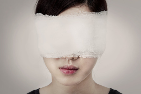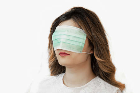 Portrait of Asian woman with bandage on her eyes isolated on white