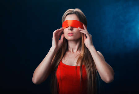 young lost and confused man blindfolded with necktie playing internet trend dangerous viral challenge with eyes blind acting doubtful guided by intuition isolated on dark background