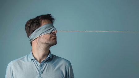 A man with his eyes covered by a cloth blindfold stands against a blue wall. A string is attached to his nose and stretched out horizontally. The man looks up towards the string.